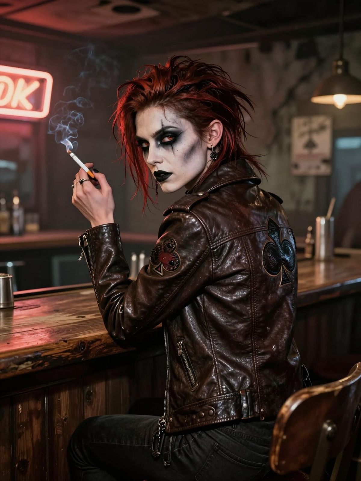 A striking image of a punk-goth character with orange eyes at a salvaged bar, holding a cigarette. Rendered with gritty textures and deep colors for a post-apocalyptic feel.