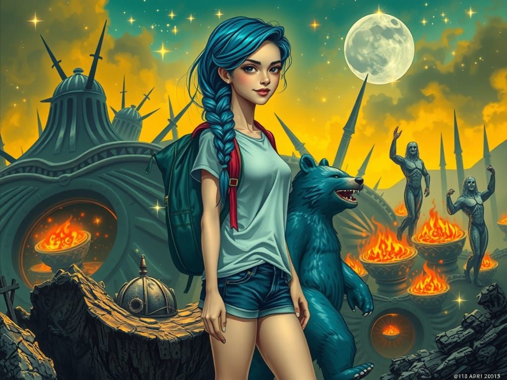 A vibrant image of a tall woman with long blue hair and a blue bear in a post-apocalyptic landscape. The artwork features rich colors and a chiaroscuro effect, reminiscent of golden age illustrations.