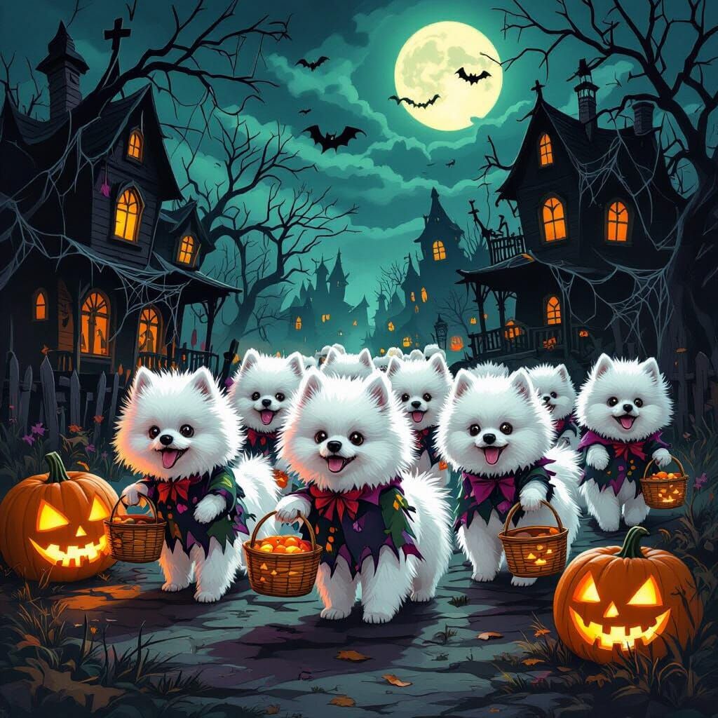 This image depicts zombified white Pomeranians collecting candy on Halloween. The scene features glowing jack-o-lanterns, haunted houses with spiderwebs, and a moonlit sky, rendered in a darkly whimsical illustrative style.
