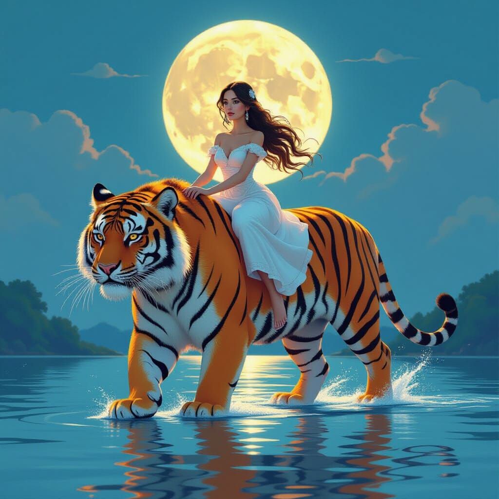 This image shows a woman with long hair riding a large orange tiger that is walking on water in the moonlight. The image is highly detailed and realistic, with atmospheric lighting.