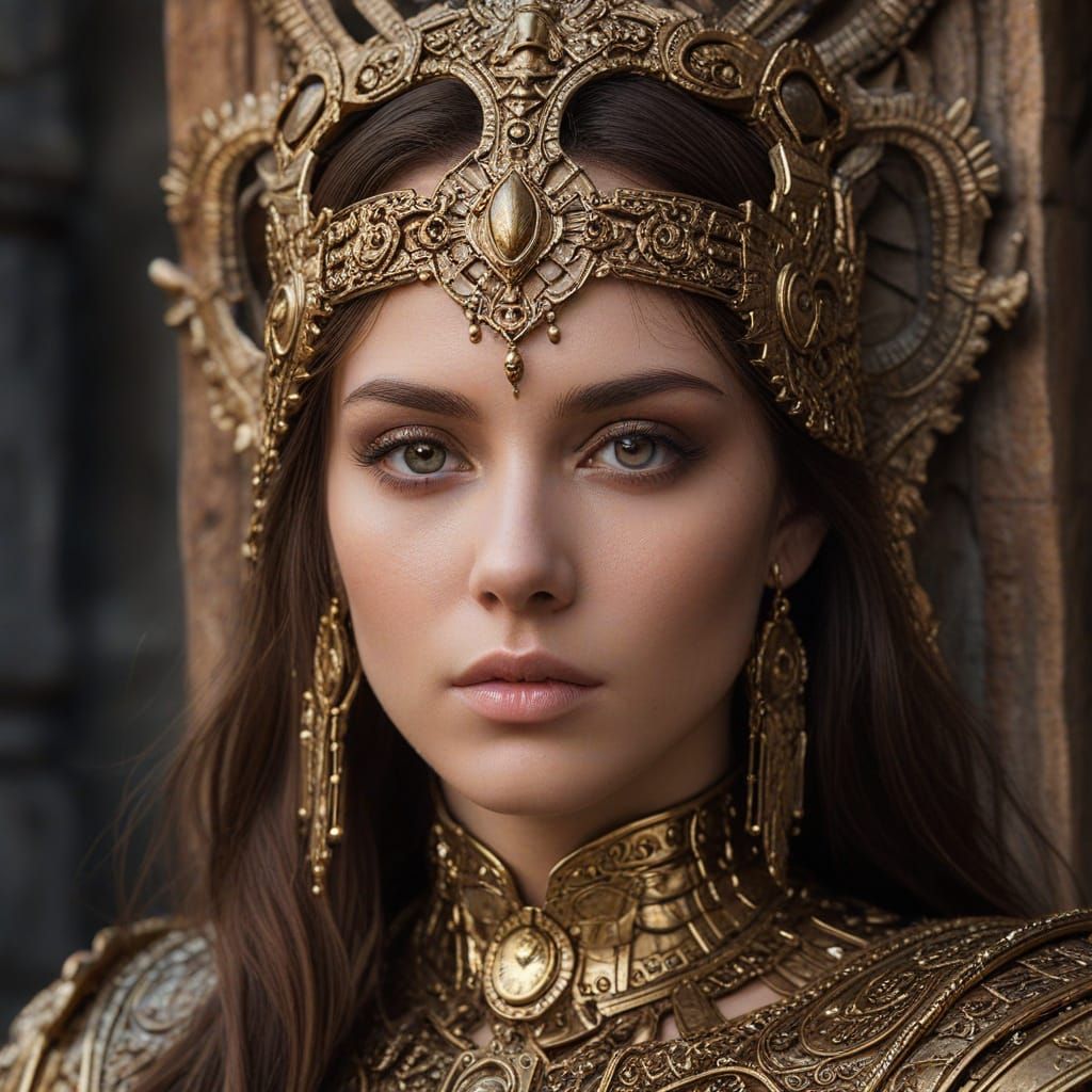 This image shows a mystical portrait of a goddess of death, adorned in gold and bronze armor, with intricate details and an ethereal glow. Inspired by dark fantasy art, the goddess exudes otherworldly beauty in a majestic, eerie setting.
