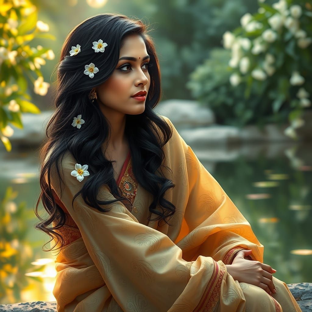 A captivating portrait of a South Asian woman with dark, flowing hair, adorned with jasmine flowers, seated gracefully by a tranquil pond, her gaze lost in thought. She is draped in a shimmering silk sari, its intricate patterns reflecting the soft, golden light filtering through the lush greenery. The ...