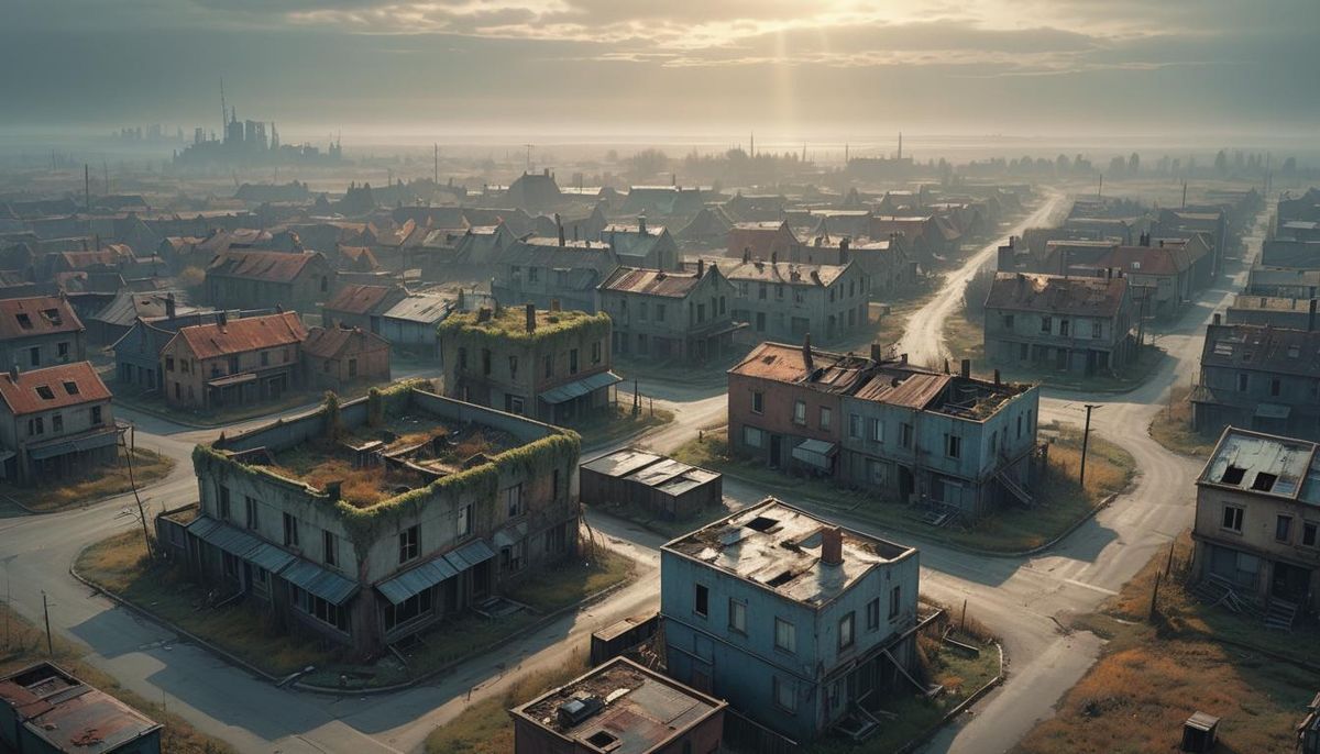 This image shows a deserted town in a post-apocalyptic landscape, with crumbling buildings and overgrown vegetation. The digital painting features desaturated colors, atmospheric lighting, and a serene, melancholy mood.