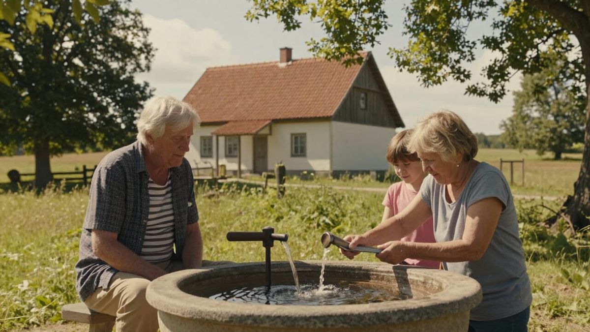 This photorealistic image captures a sunny summer day on a farm. Elderly people and children interact joyfully near old buildings and a water well, bathed in warm, natural light.
