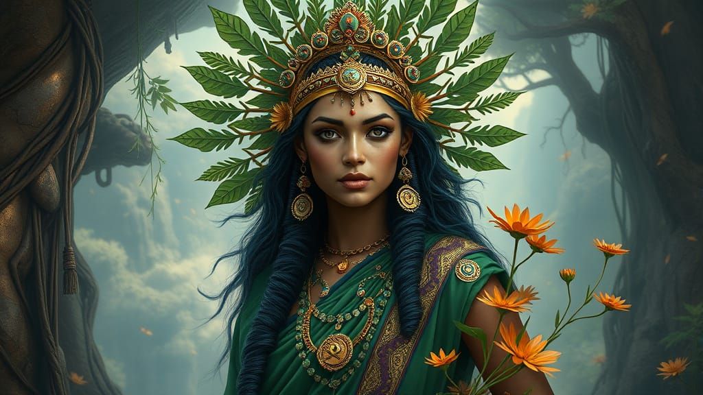 This image shows a detailed and realistic depiction of the Babylonian nature goddess ARURU, surrounded by elements of nature and accompanied by Enki, in a style reminiscent of hyperrealistic art and cinematography.