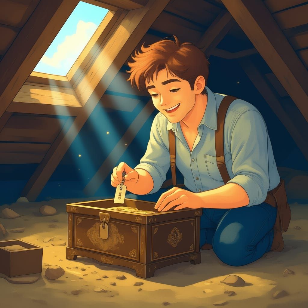 A young photographer kneels in a sunlit attic, captivated by an ornate box and a tarnished key with faded writing, evoking a sense of memory and mystery.