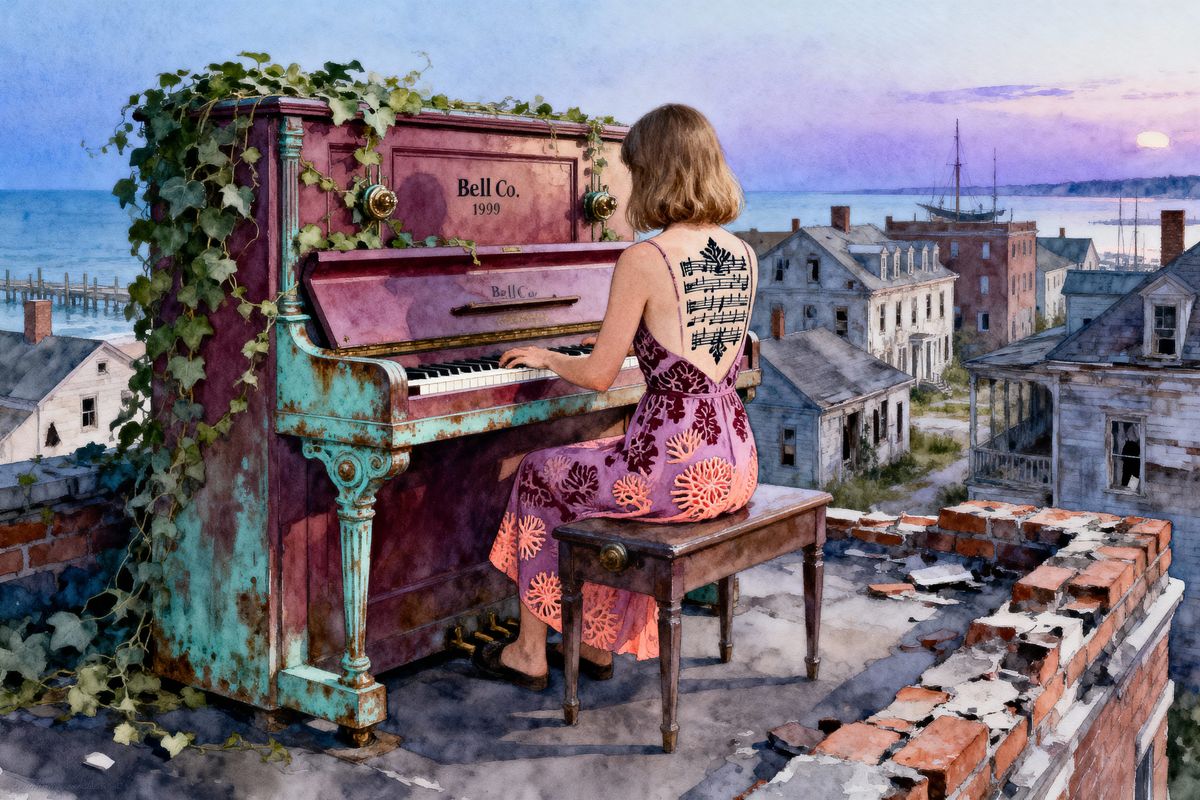 A limited-palette John Blanche style rear-view watercolour of a woman (brain-coral pattern mauve/salmon-pink ankle length sun dress; back-length light-brunette hair; black/navy-blue/dark-maroon sheet-music pattern back-tattoo) playing a piano (Bell & Co 1929 stand-up model; pale-oxblood varnish; verdigris ...