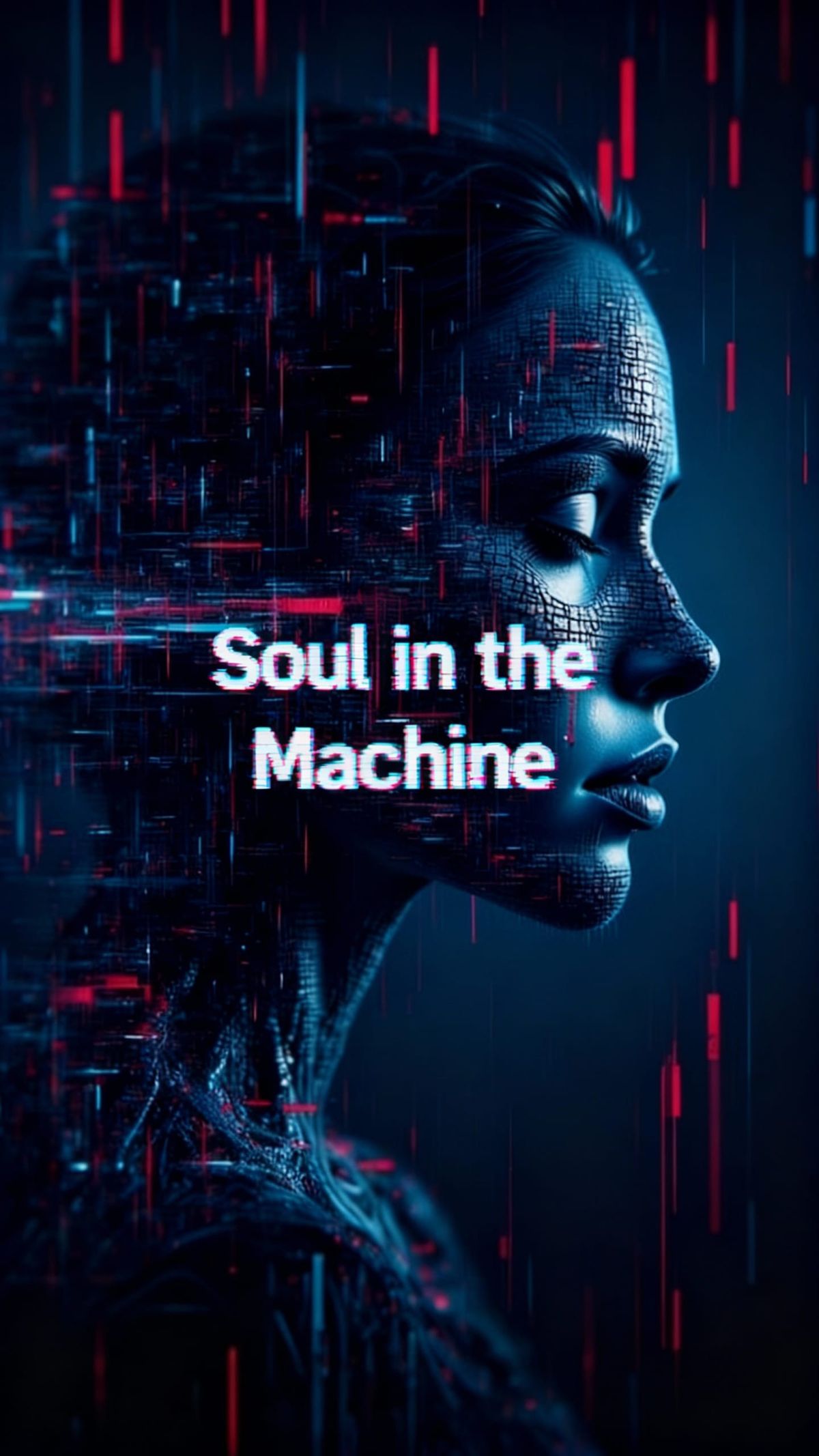 This image explores the concept of a soul within a machine, rendered in a minimalist voxel style with a dark indigo background and glitch art effects.