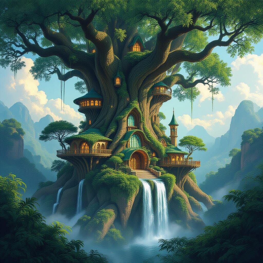 A sprawling treehouse city winds through a giant ancient tree. Lush foliage, waterfalls, and bioluminescent flora are rendered with soft lighting in an art nouveau style reminiscent of Studio Ghibli.
