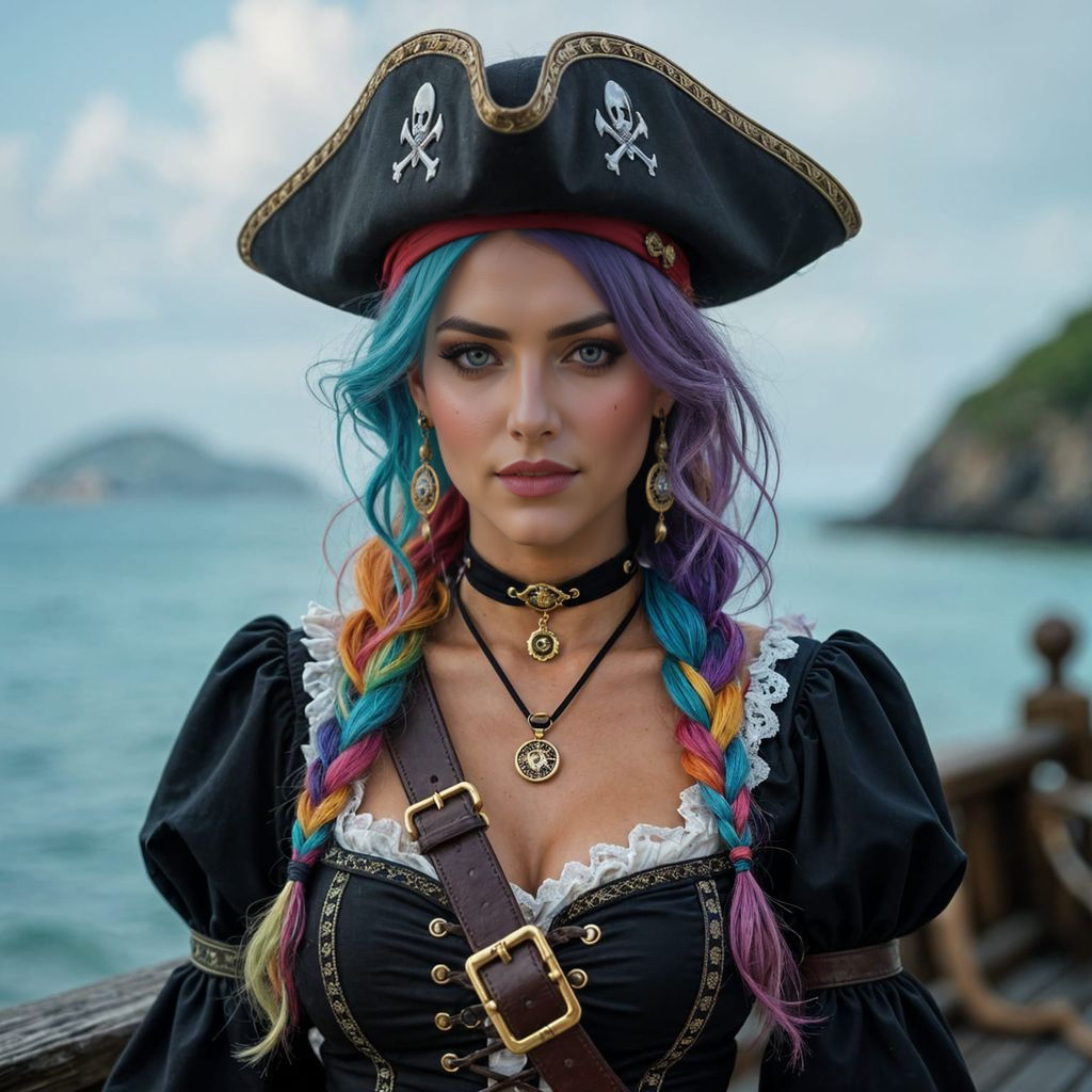 "High fantasy epic attractive female pirate bard, colorful hair, black dress, scenic background, high detail, high quality, correct anatomy, Cinematic film still, shot on v-raptor XL, film grain, vignette, color graded, post-processed, cinematic lighting, 35mm film, live-action, best quality, atmospheric, a masterpiece, epic, stunning, dramatic intricate details, HDR, beautifully shot, hyperrealistic, sharp focus, 64 megapixels, perfect composition, high contrast, cinematic, ..."