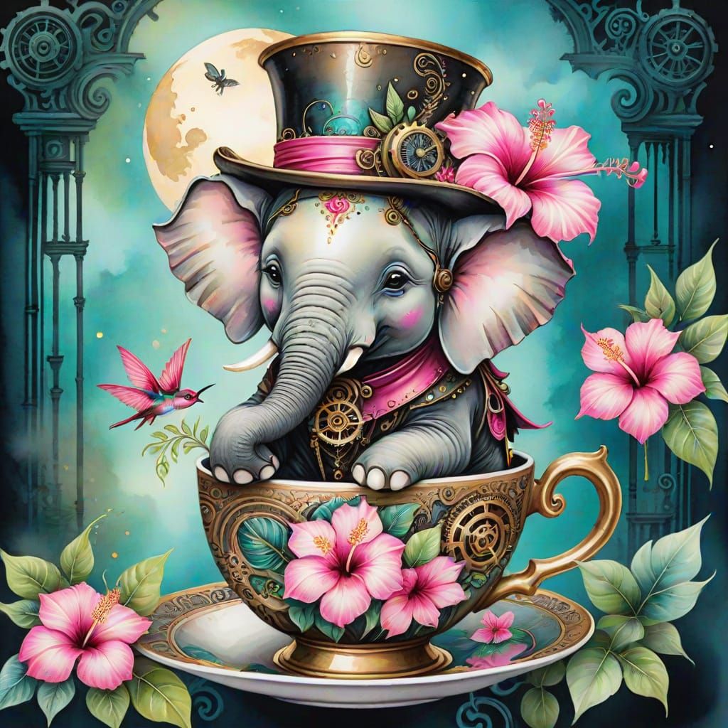 This image shows a steampunk-style baby elephant wearing a top hat inside a bamboo and hibiscus flower. The scene includes a teacup, Indian Palace backdrop, hummingbird, gears, and brass accents in watercolor.