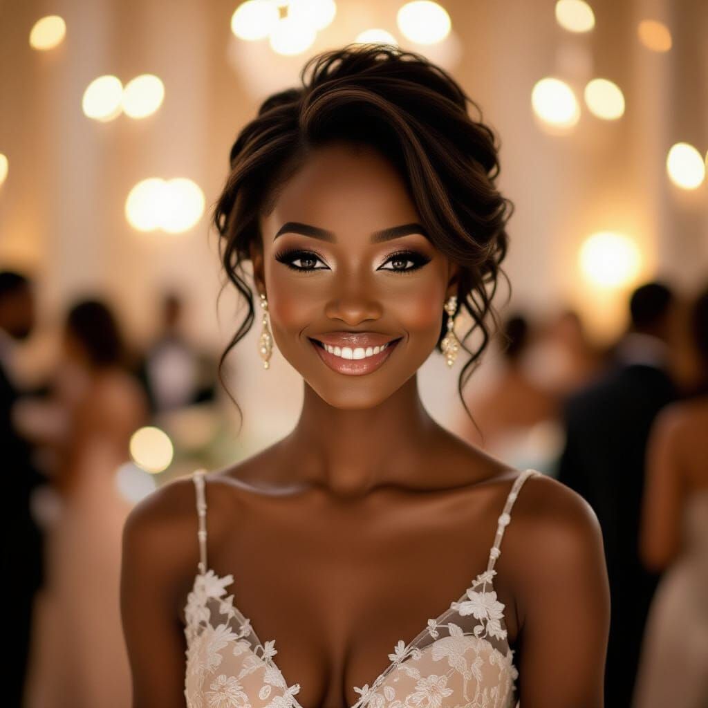 A shy Nigerian woman in a simple dress stands alone at a wedding. The scene features warm, diffused lighting and a shallow depth of field, creating a dreamy atmosphere. Digital painting with romanticism.