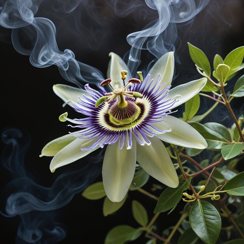 This image shows a passion flower surrounded by swirling smoke. The wisps of smoke create a dreamy, ethereal effect around the delicate petals of the flower.