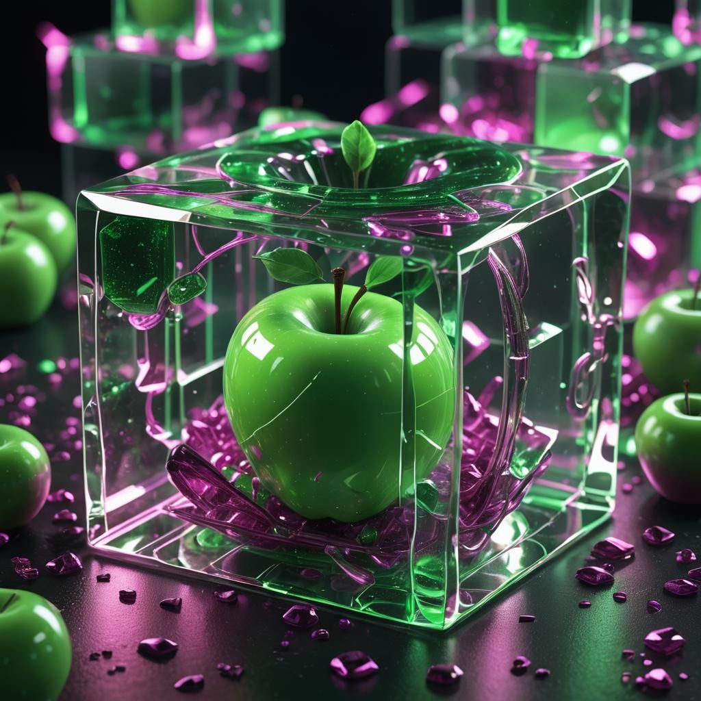 A hyperrealistic matte painting featuring a green apple candy with a worm inside, viewed through a green crystal cube. The image features neon lighting, dark shadows, and complementary emerald and magenta colors.