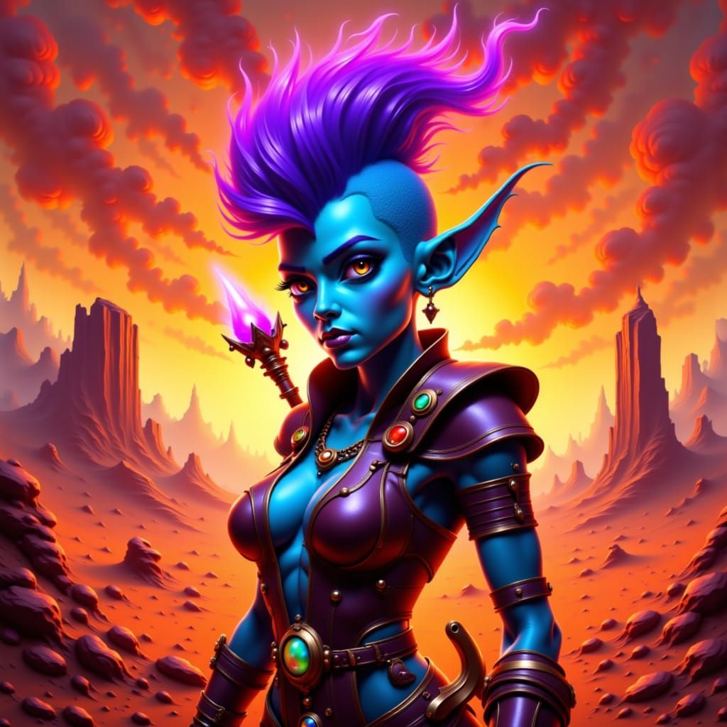 A striking image of a blue-skinned troll with a purple mohawk confidently facing the viewer. The troll is set against a desolate desert landscape with fiery skies. The image is rendered with bold graphics and moody lighting.