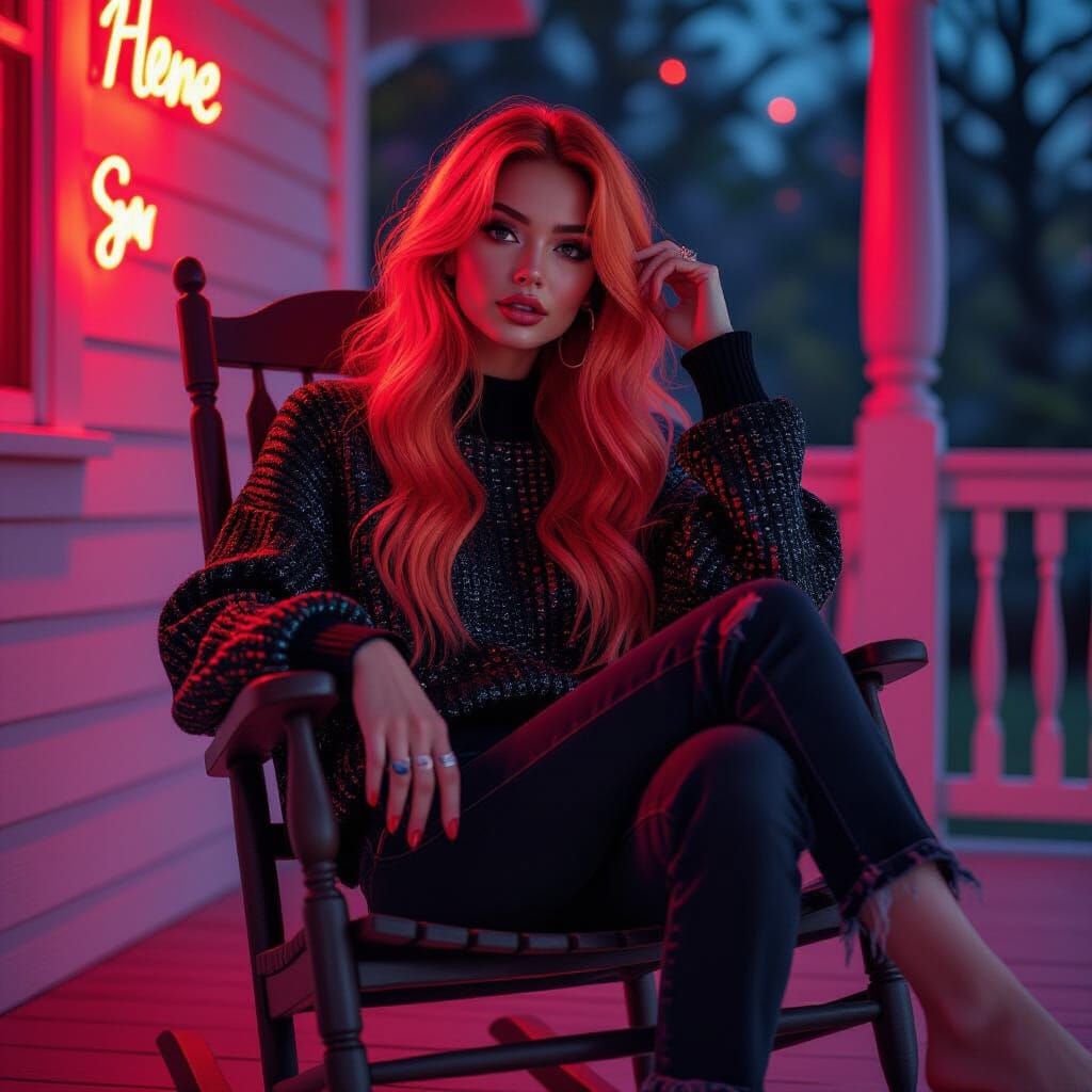 This image shows a glossy-skinned woman with vibrant orange hair sitting on a porch. She is surrounded by red neon lights in a cyberpunk aesthetic, with dynamic brushstrokes and electric colors.
