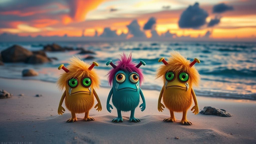 A digital artwork of three small, melancholic monsters with large green eyes on a sandy beach at sunset. The image evokes a bittersweet atmosphere, blending sadness and vibrant color.