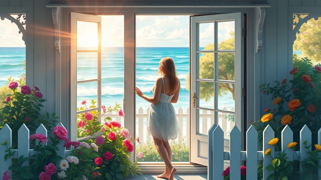 This image shows a serene woman in a glass cottage doorway. A vibrant garden and white fence overlook a turquoise sea. The scene evokes Impressionist paintings with soft brushstrokes and warm sunlight.