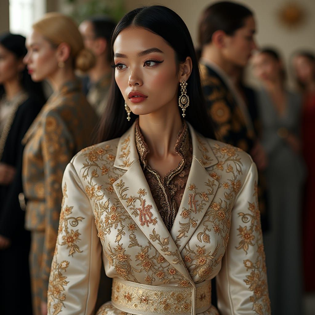 This image shows a luxury fashion model in a custom jacket, surrounded by designer clothing. The image blends intricate details with a futuristic aesthetic and elegant lines.