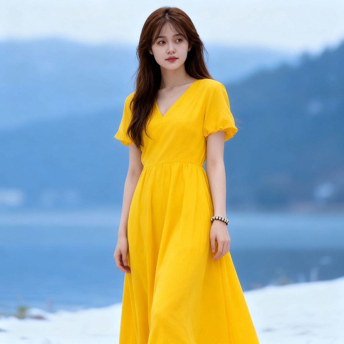 This image features a full-body portrait of a woman wearing a pink dress, a brown silk scarf, and bracelets, set against a scenic landscape.