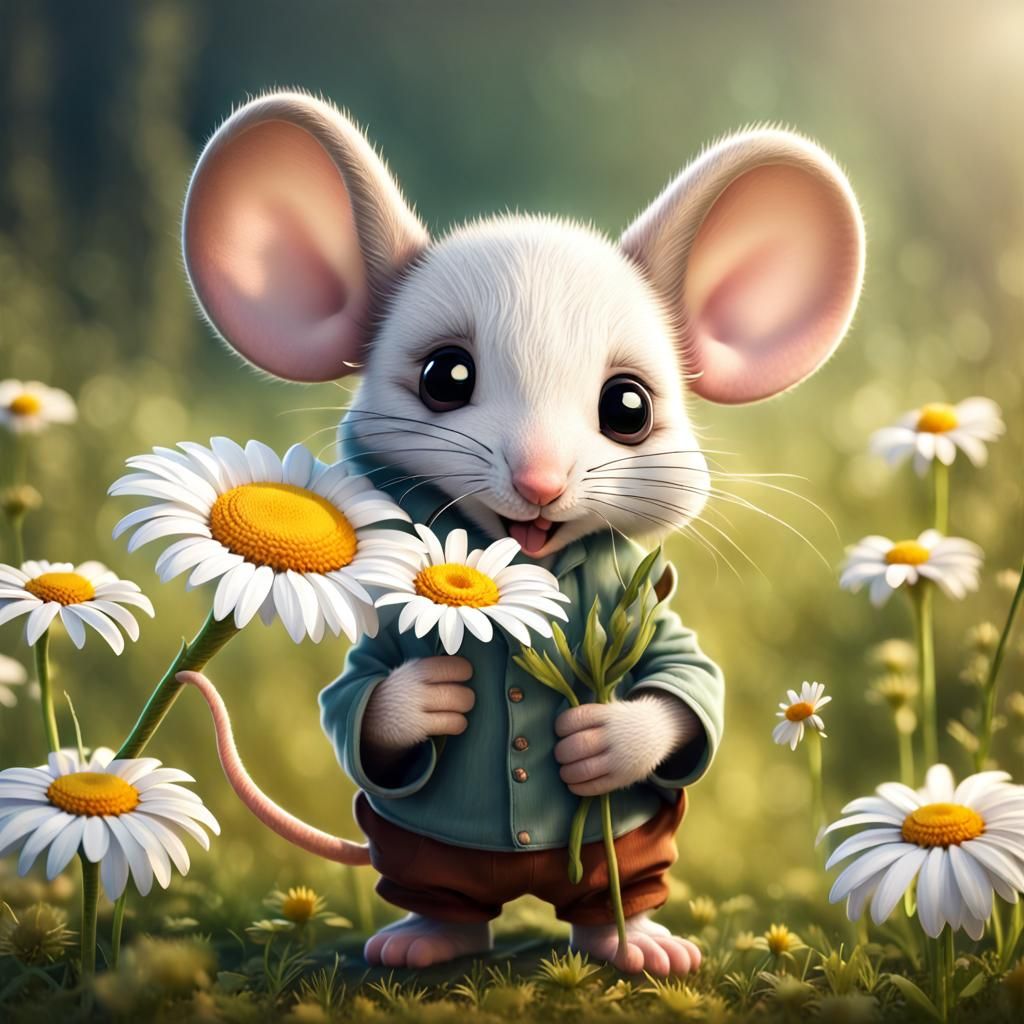 This image shows a charming mouse with oversized ears carefully holding a giant daisy. The picture captures the mouse's delicate interaction with the flower.