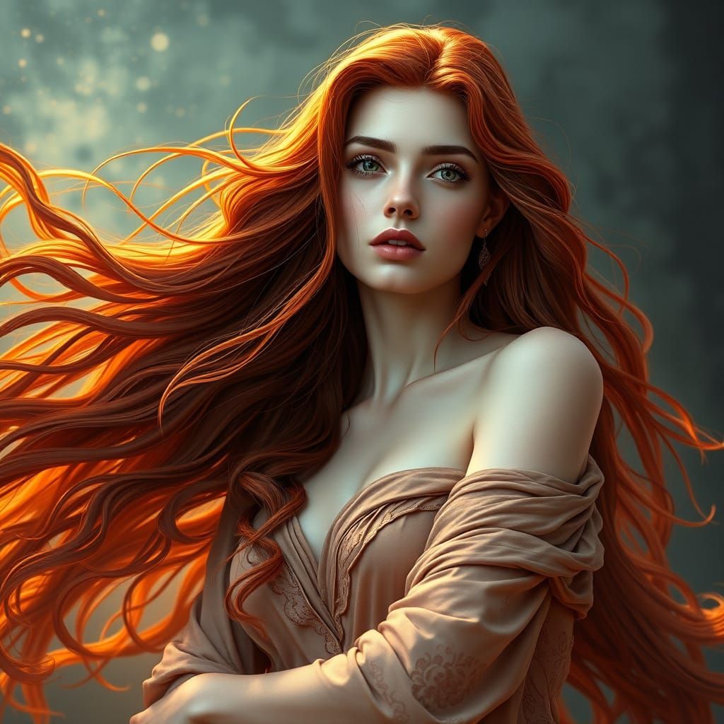 This image shows a beautiful woman with auburn hair in a bare-shouldered dress. Her serene expression hints at vast knowledge, rendered with dynamic lighting and triadic colors in an ethereal art nouveau style.