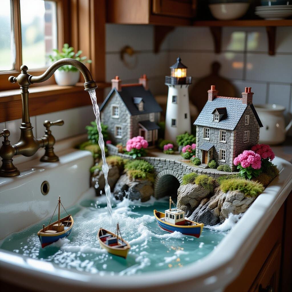 Look here, someone’s gone and flooded the kitchen with imagination, of all things. That’s right—full boats, lighthouse duty, and rhododendrons blooming like they’ve never heard of plumbing codes. I’d wager the saltwater’s got a hint of dish soap and rebellion. Sink-sized maritime magic!
