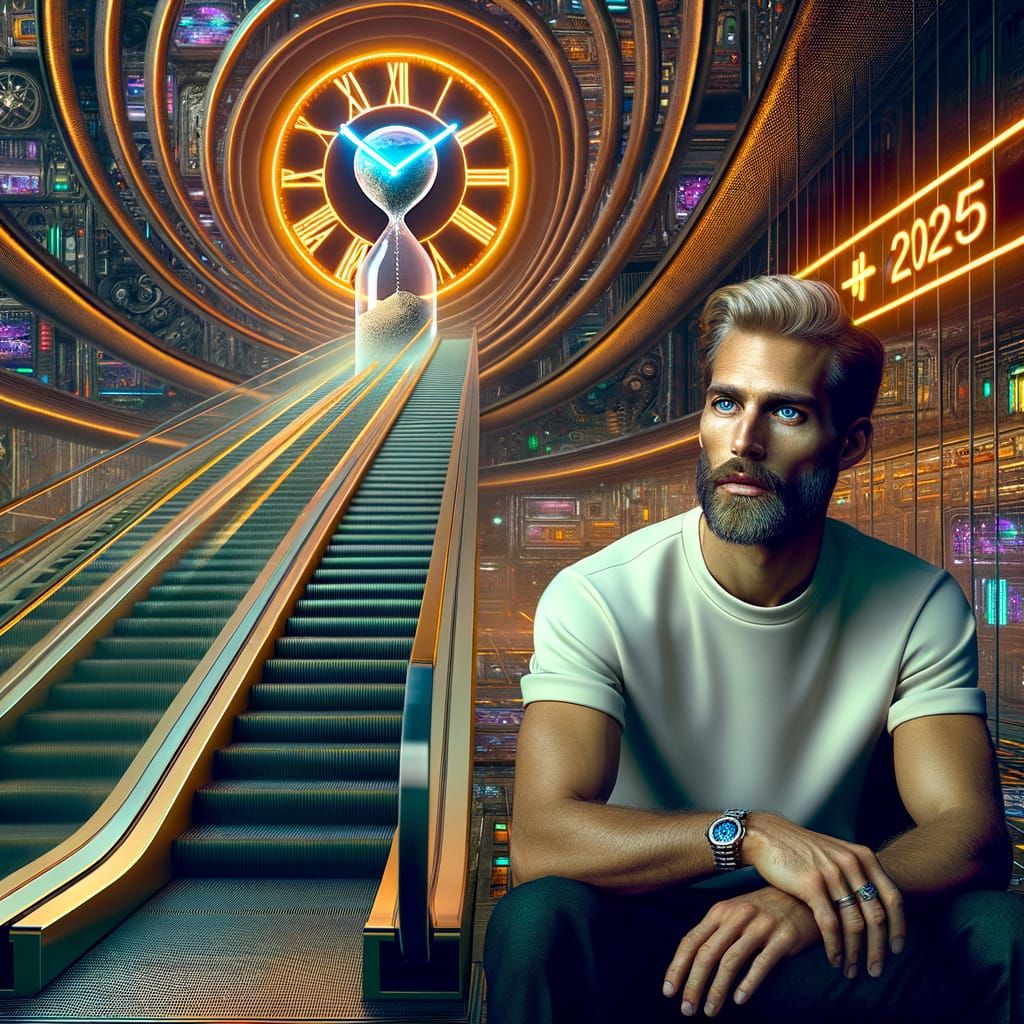 This striking image shows a surreal scene of an endless revolving staircase with a melting clock, featuring a man with a sculpted physique, rugged face, and mesmerizing eyes, exuding confidence and power, set against a vibrant neon-lit backdrop.