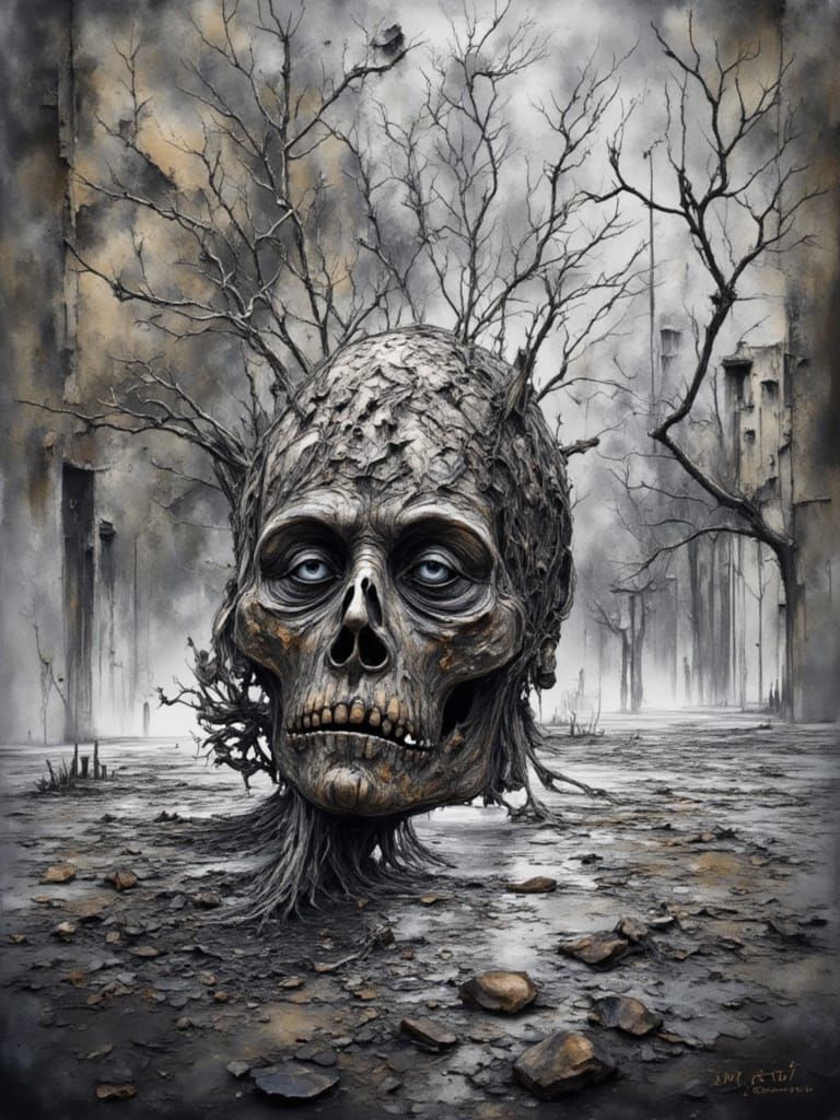 This image displays a sketchy, washed watercolor effect, evoking a sense of abstract confusion with rusty, decayed elements.