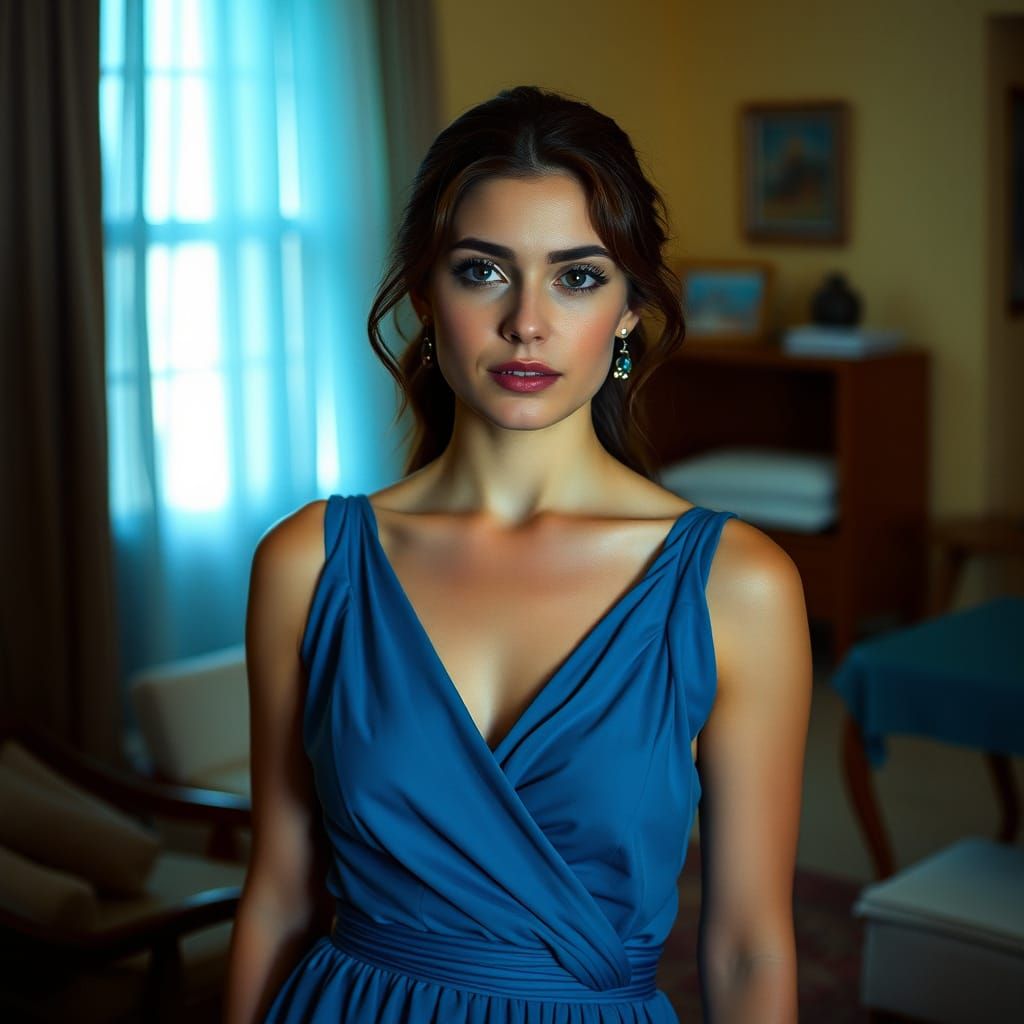 A photorealistic image of a beautiful young woman in a blue dress, standing in a room with light blue curtains. The image features cinematic lighting, film grain, vignette, and calibrated color in a hyperrealistic style.