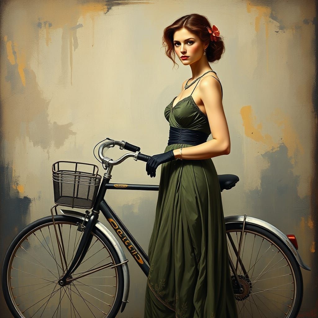 This image shows a woman in an elegant dress standing beside a bicycle, wearing gloves, in a whimsical art style inspired by the intricate details and expressive brushstrokes of Art Nouveau masters.