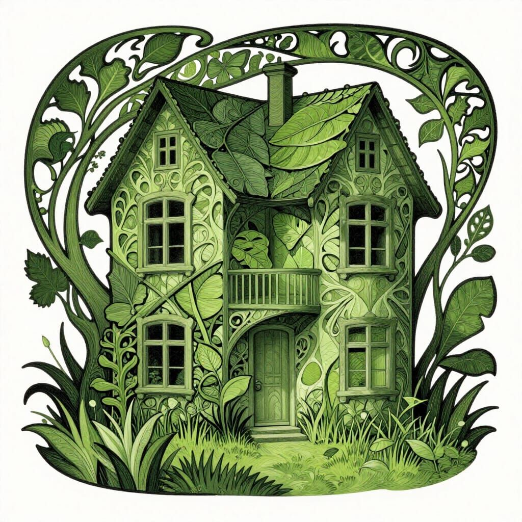 This image showcases a detailed Art Nouveau illustration of a charming house constructed from leaves and grass, rendered in black and various shades of green. It evokes a sense of wonder with its flowing organic lines and decorative style.