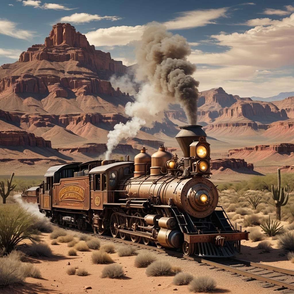 A digital image of a steampunk-style locomotive in the American Southwest. The Victorian-era train is set against a desert landscape in sepia tones, as digital art.