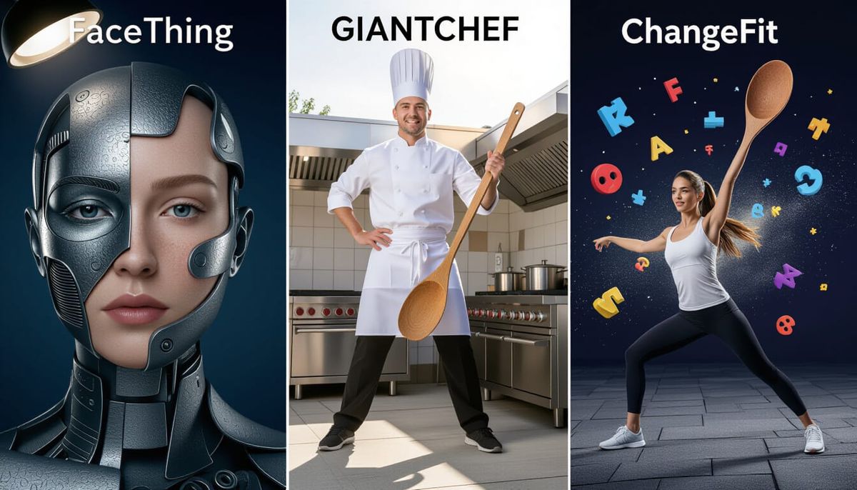 This image displays five distinct ultra-realistic photographic panels exploring anagrams: a surreal face, a giant chef, a dynamic fitness transformation, insincere conversation, and a tender woodland moment.