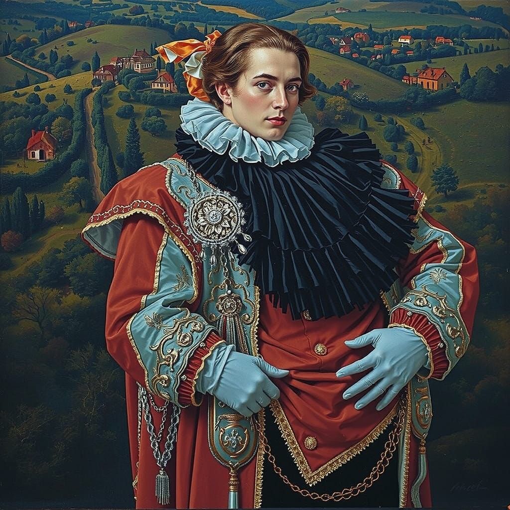 A scenic view of a figure in vintage clothing in the French countryside. The image evokes a rococo style with soft light and intricate details, blending realism and romanticism.