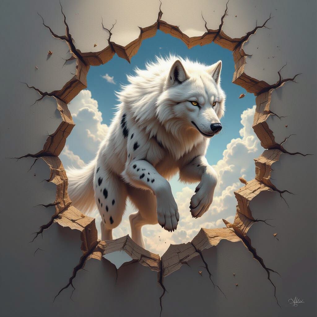 A regal hybrid Polar Wolf x white Leopard, flowing white and brown-colored fur with distinctive black and white patches bursts through a crack in the sky in a dynamic leap, tearing through the celestial rupture. The hybrid's powerful hide shows intricate hide texture details, while its massive muscular ...