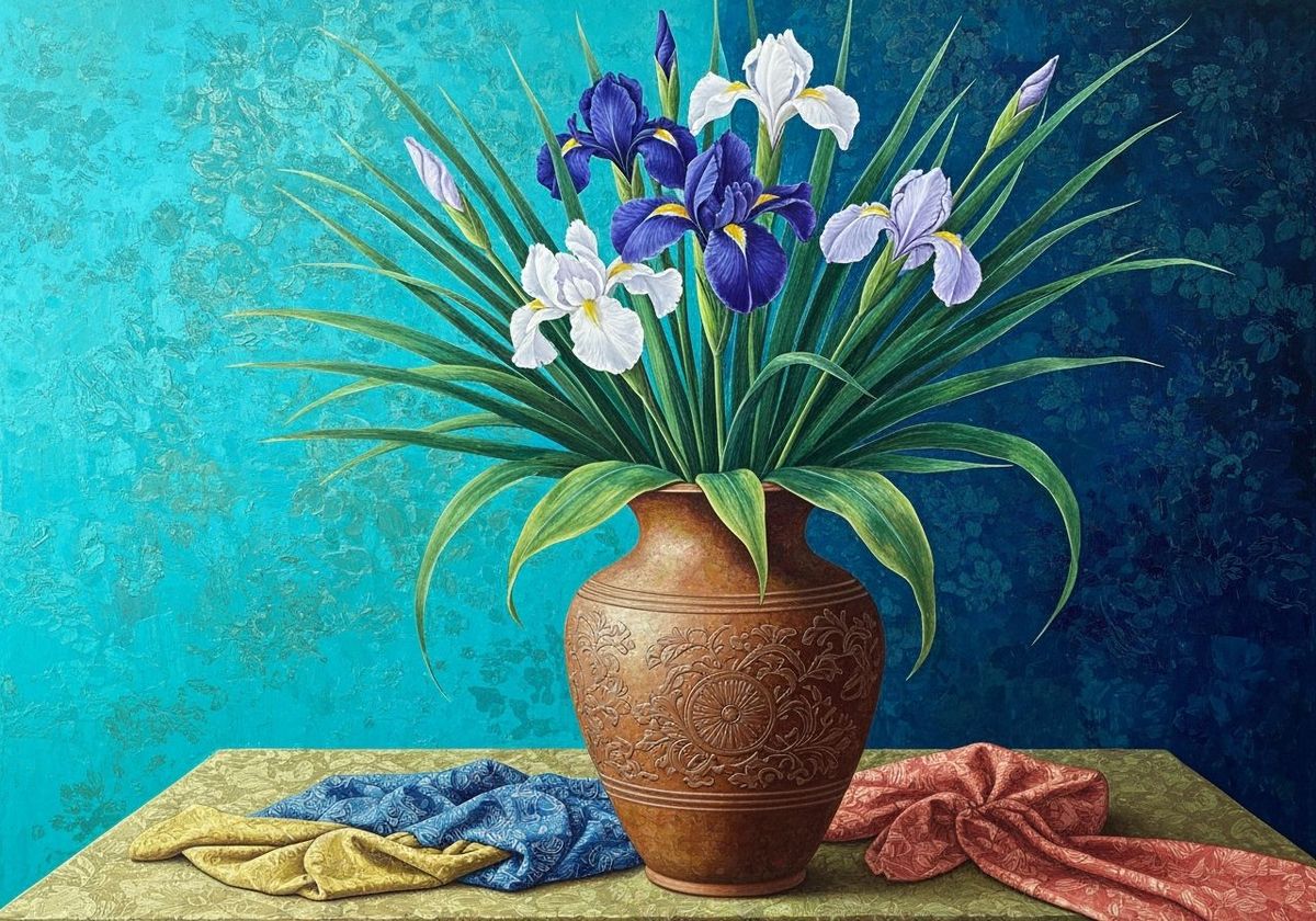 This image shows a vibrant ikebana bouquet of irises in a terracotta vase. The artwork evokes classical Asian art through delicate brushstrokes and subtle gradations in indigo, turquoise, and terracotta hues.