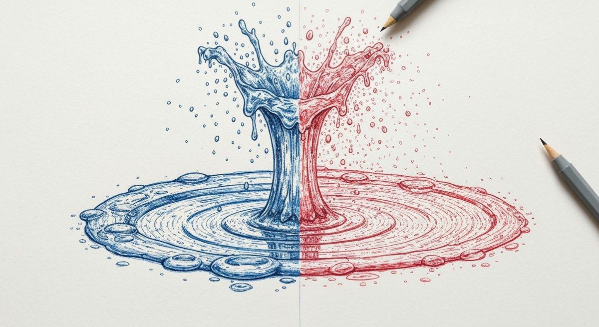 This image shows a hyperdetailed colored pencil drawing of a raindrop on a leaf, merging realism with artistic creation. It captures a magical transformation.