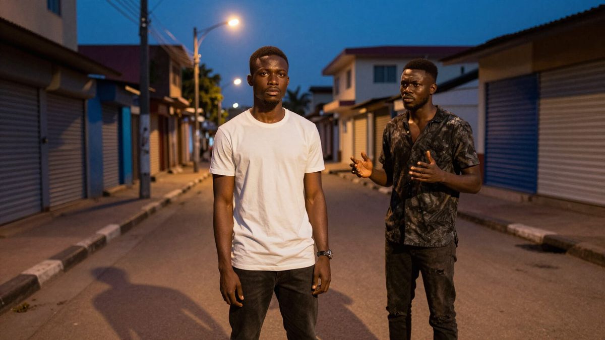 This image depicts a realistic cinematic scene on a quiet Lagos street at evening. Two young men, one calm and resolute, the other tense and aggressive, stand facing each other, highlighting a dramatic emotional contrast.