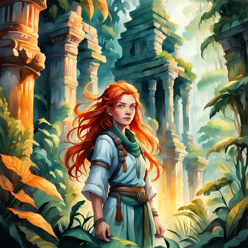 A concept art image of Rebecca Cunningham, a red-haired adventurer, in a misty jungle temple. The watercolor-inspired art features vibrant colors, exotic foliage, and soft, ethereal light in pastel hues.