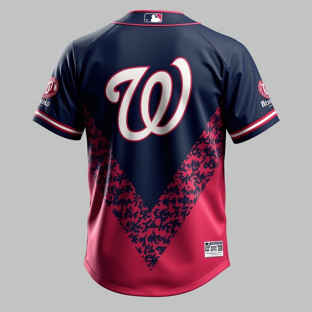 This sleek city connect jersey for the Washington Nationals in 2026 features a bold diamond pattern inspired by modern sportswear design, with a metallic silver and gold curly 'W' logo on a deep navy blue and cherry blossom pink background