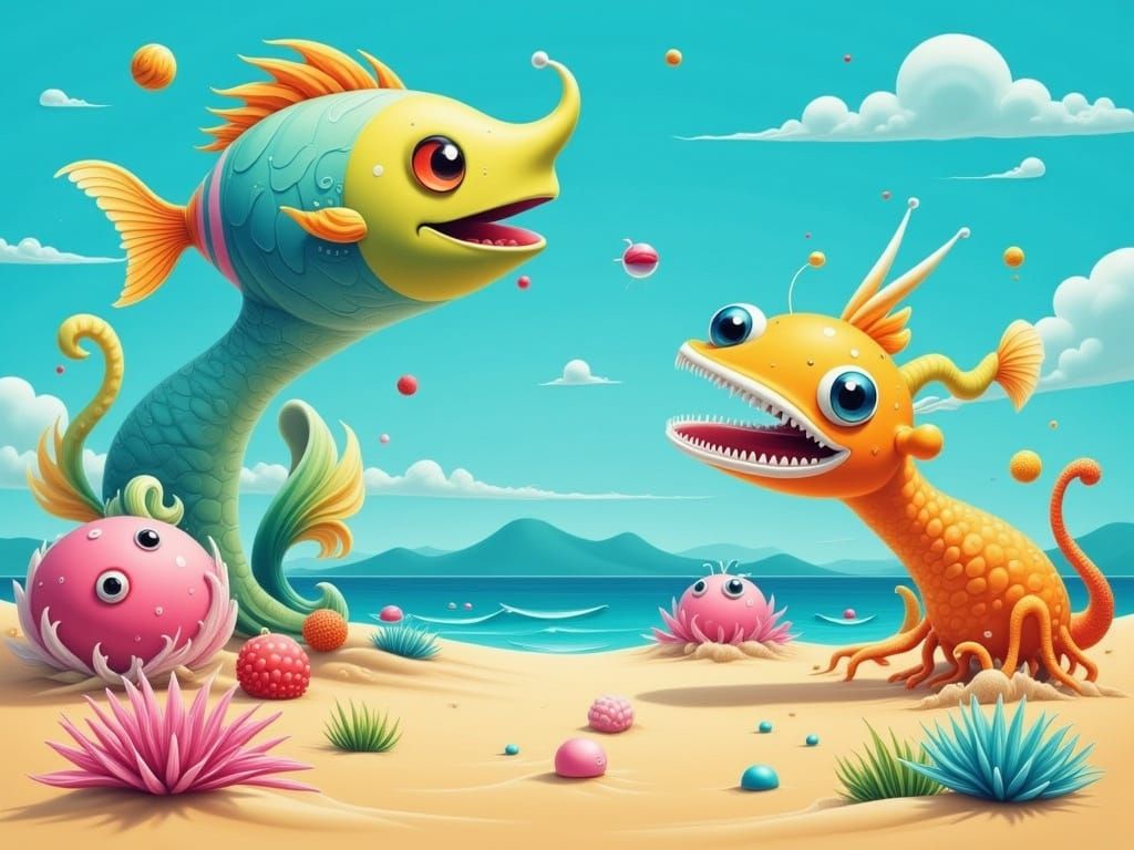 This image shows a breathtaking desert landscape with a majestic rainbow waterfall, set against a deep blue ocean and filled with vibrant, cartoon-like marine life, in a style reminiscent of pastel-colored, hyper-realistic art.