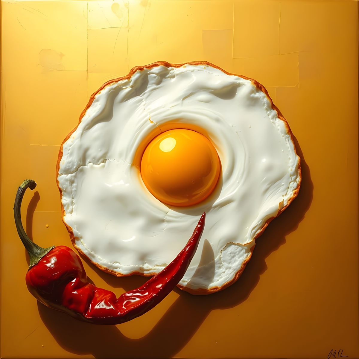 This image shows a surreal golden fried egg, sunny side up, with a dried red pepper. Macro and avant-garde styles create an abstract geometric background with scratches.