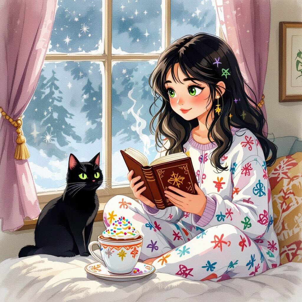 This image shows a teen witch in pajamas with her cat. The witch is gazing out the window with a spell book. This digital painting has the style of watercolor textures.