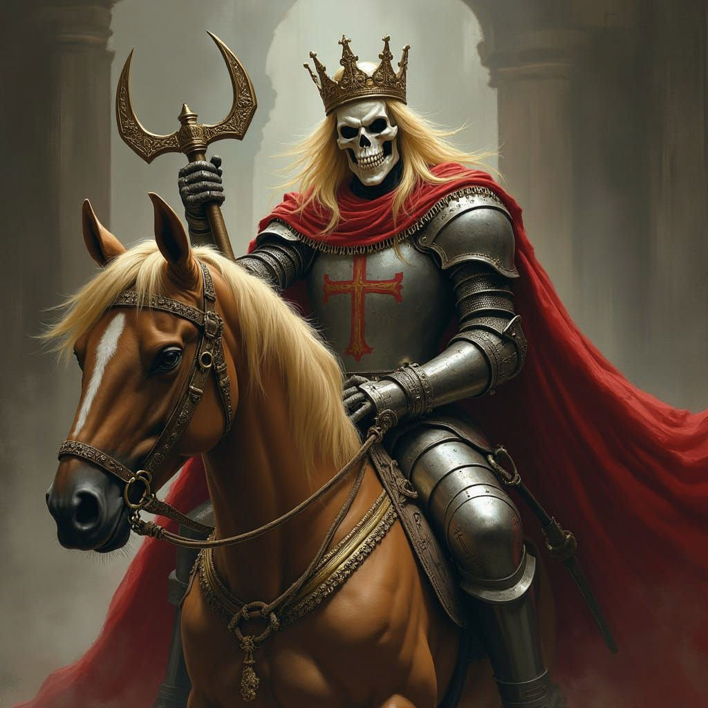 This image shows a regal knight with a skull face, blonde hair, and a golden crown. The knight holds a sceptre while sitting on a light brown horse in dramatic lighting, in a dark fantasy style.