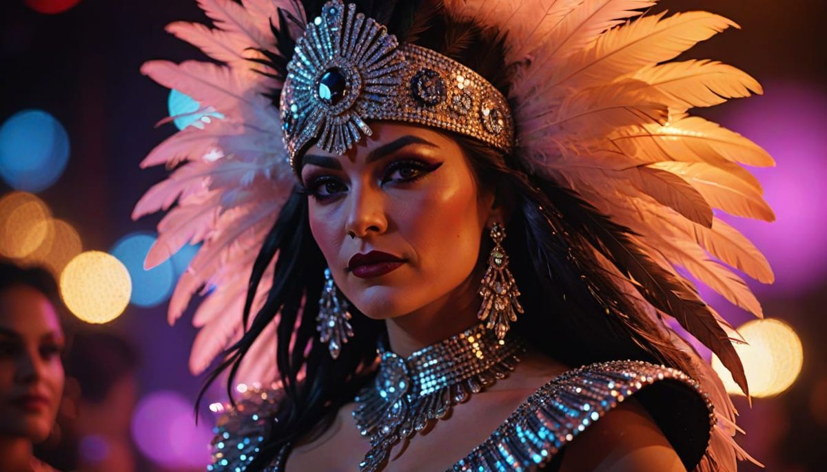 A close-up image showcases a cabaret dancer in a feathered headdress, complete with sequins, set against dazzling stage lights. The image features vivid colors and a shallow depth of field, captured with a Canon lens.