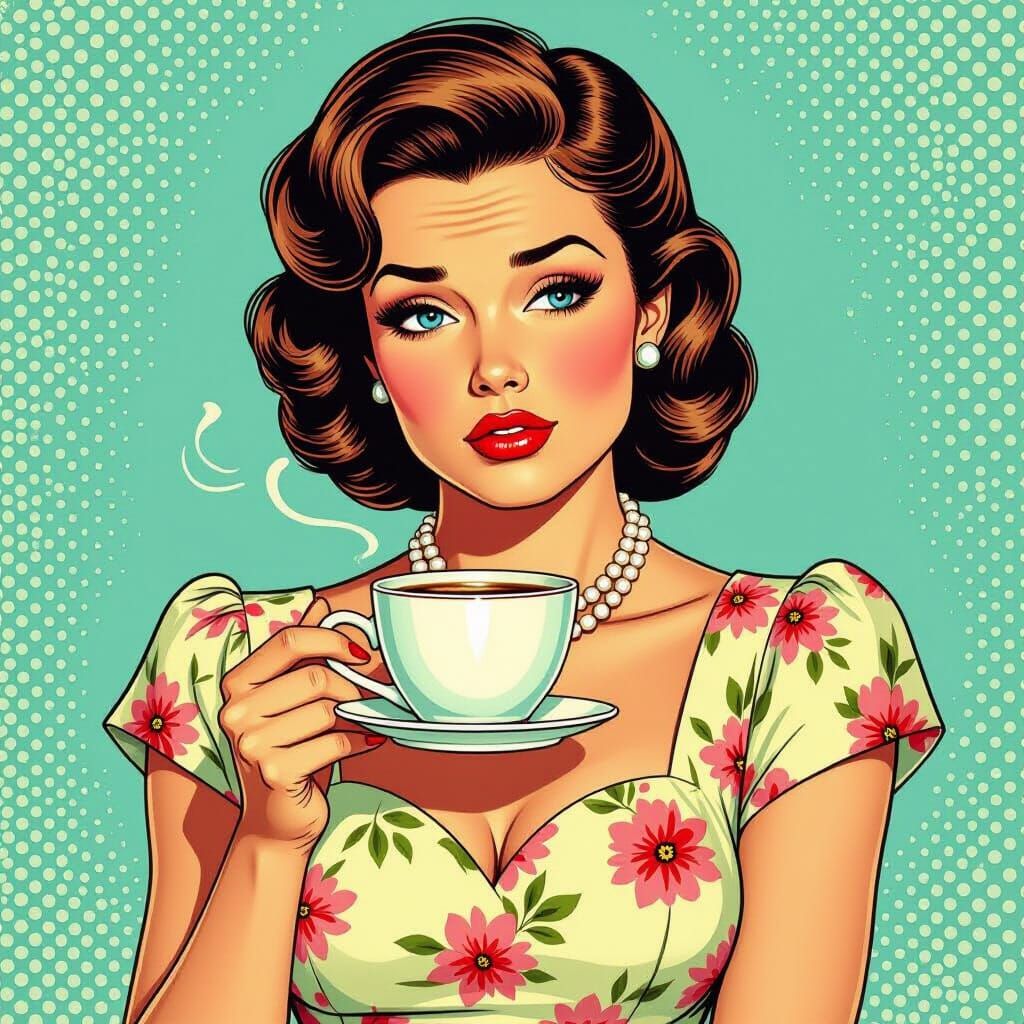 A retro comic book image of a 1950s woman with a tired expression, holding a coffee cup. The art style features bold lines, vibrant colors, and intricate textures.