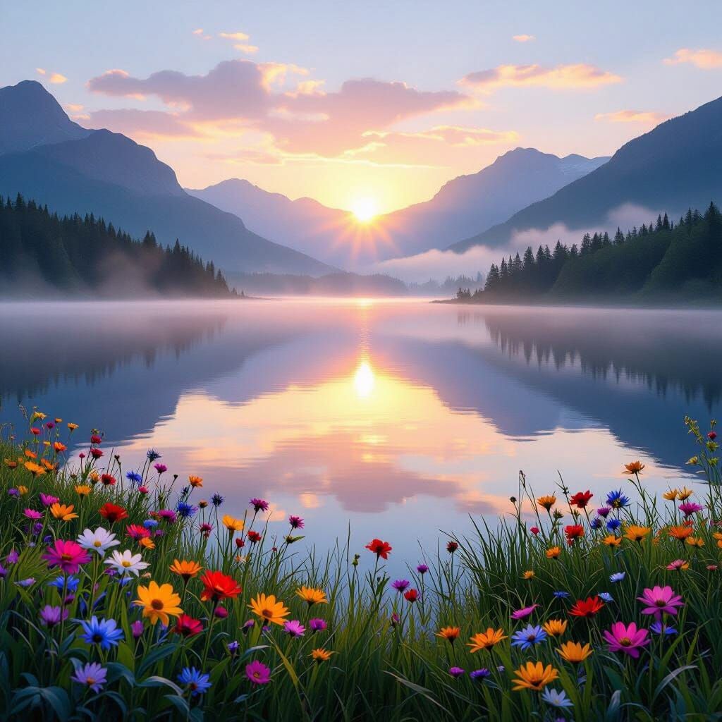 A breathtaking image of a tranquil mountain lake at sunrise. Mist hangs over the still water, reflecting the colorful wildflowers in the foreground. The scene evokes peace and serenity in a photorealistic style.
