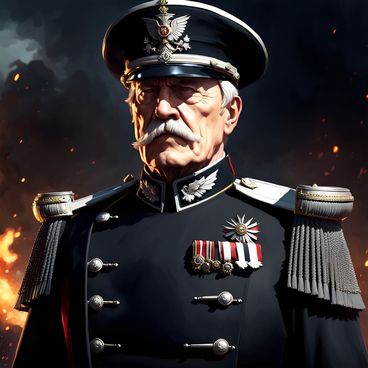 A portrait of Otto von Bismarck as a Warhammer Imperial Army officer on a battlefield. The image features dynamic lighting, intricate detail, and a vibrant color palette.