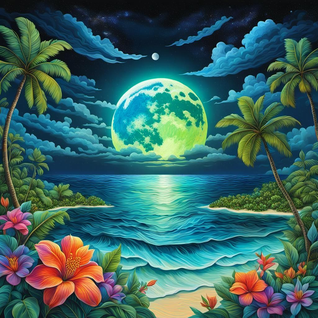 A vibrant image of the Maldives at night under a cosmic sky. Features a bright moon, colorful tropical flowers, and topaz blue waters, rendered as a holographic astral illustration.